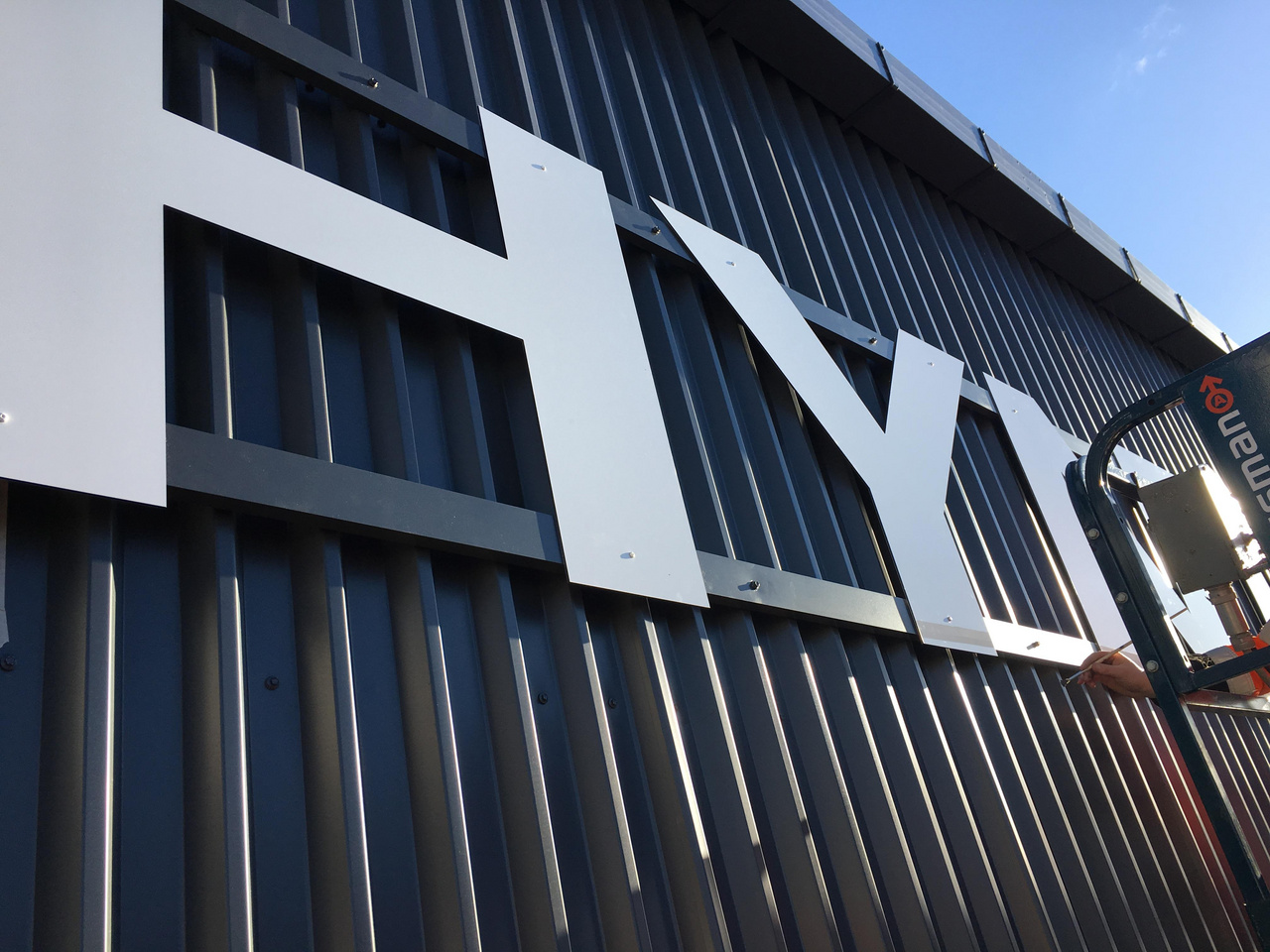 The design was installed on June 5th, 2019 and required a small team and the use of scissor lift to get the wording in place. The building itself has a corrugated iron exterior so the wording had to be set onto solid alloy bars before being fixed to the wall. This ensured the wording was flush with the exterior. Prefixing it also meant that the installation itself was quicker and it has a far better finish.